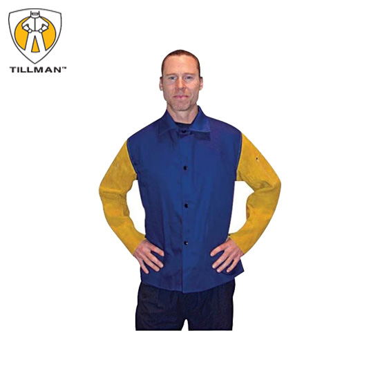 有皮袖的藍色防火夾克服